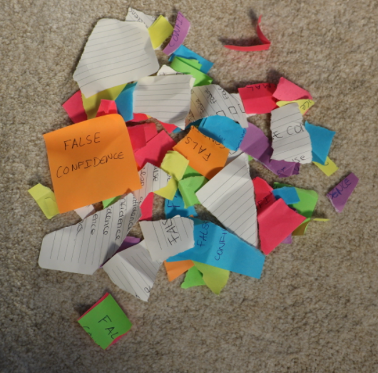 Sunday afternoon I exported everything into my computer and then shot all the equipment videos as well as the video of the cross-cutting scene with the bin getting fuller with post-its. I also filmed the "holes in my false confidence" shot which was a bit hard because the holes weren't visible on the notebook, so I placed the blue filter behind that page to make the holes look dark and noticeable. I used the tripod to film both shots as they relied on the bin and notebook staying on the same place and their contents changing.
